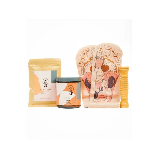 The philosophy of reflexology determines that areas of the foot correspond to different organs and systems of the body. Treat yourself to this soothing ritual designed to encourage relaxation and alleviate stress whilst leaving you feeling silky smooth. Start by gently massaging the nourishing foot balm into your feet paying particular attention to heels and other areas of dry or hard skin, slip on your reflexology socks, and allow a minimum of 5 minutes for the balm to soak into your skin. Then use the wooden roller and gently massage your feet, locate the corresponding organs and body systems shown on your socks and apply desired pressure. To finish fill a bowl or foot spa with enough warm water and 2-3 scoops of the foot soak.