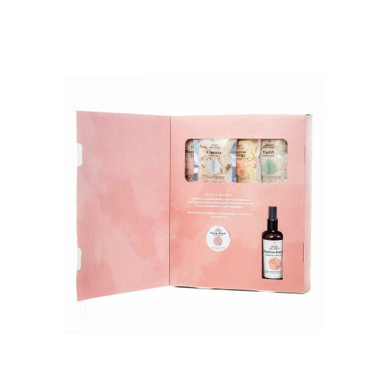 Contains: room mist (105 ml), pulse point balm (20 g), 4 packages of bath salts (50 ml each)