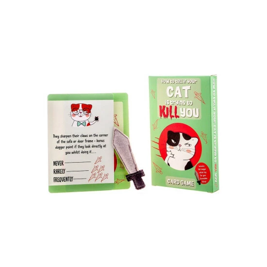 Always thought your cat was evil? With this hilarious new card game, you can find out if they really are planning to kill you…or maybe it is just kitten! Simply work through the 52 large format playing cards and tally up the daggers to figure out whether behind your cat’s meow….is murder on the mind! Packaged in bright packaging with a fun catnip toy, hopefully you can keep your furry friend on your side! Perfect as a fun novelty gift for cat-lovers everywhere this game can be played individually, or to find out who has the most evil cat of all! The 52 large-format cards feature actions of a killer cat…rate how often your cat does them (from never to frequently), and tally up the daggers – the more daggers, the more scared you should be! CATNIP TOY INCLUDED – With a catnip felt fish-shaped toy included with the game, no matter how evil your cat can turn out to be…you can win them onside! PERFECT GIFT FOR CAT OWNERS – This hilarious game is the perfect fun novelty gift for cat owners on their birthday or at Christmas, and can be played individually, or as a group, to see who has the most evil cat!
