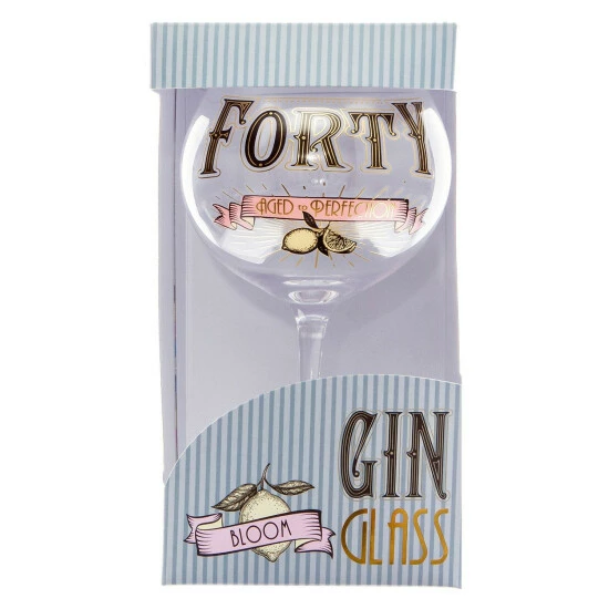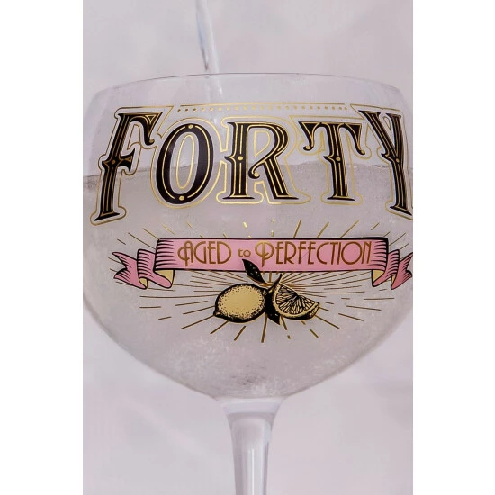 Celebrate a special 40th birthday in style with this gorgeous decorative gin glass. This glitzy glass is decorated with beautiful text that reads “Forty – Aged to Perfection” and glamorous print detail in black, gold, pink and ivory. Packaged in a stylish gift box, this prohibition style glass makes the perfect gift for a perfectly aged gin fanatic on their fortieth birthday.