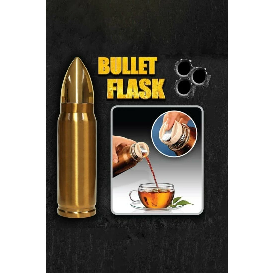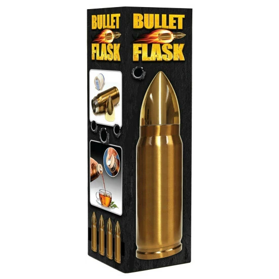 Designed to look like a bullet, this unique stainless steel flask is wonderful for keeping beverages hot or cold for up to 8 hours. The double wall insulation works to keep your beverages at your preferred temperatures, and the leak-proof lid allows your bullet flask to be turned in all directions. The click-and-pour stopper makes it easy to transfer your liquids to a mug, glass, or soup bowl. This unique bullet shape is fantastic for those that enjoy hunting or other outdoor activities. The design draws attention and is a great conversation starter. Great for Christmas, birthday, or any special occasion.