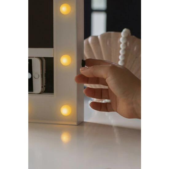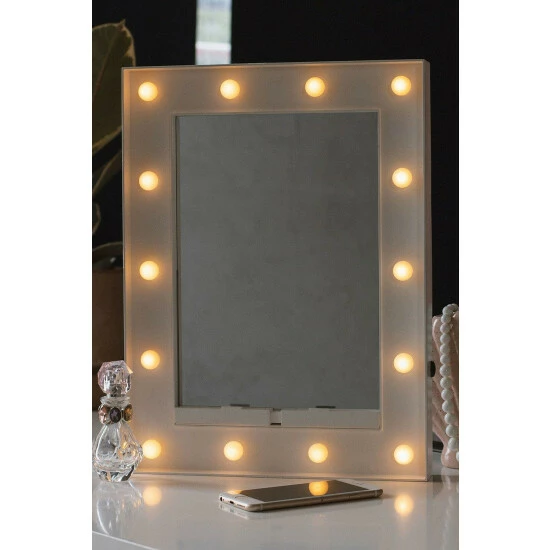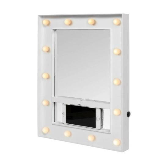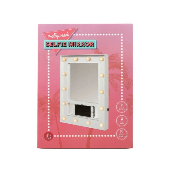 Selfie mirror for the perfect selfie. Has 12 LED bulbs to create ideal lighting. Compatible with most phones and smaller tablets. Requires 2 x AA batteries; not included. Weight: 824g. Dimensions: 29.8 cm x 39.8 cm x 4 cm