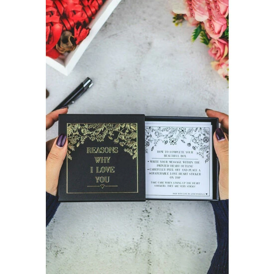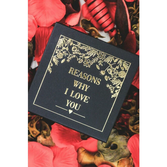 Why I Love You Personalised Cards. Beautiful black cards with a gold heart. Personalised cards showcased in a sentimental keepsake box.Dimensions: 2.5 cm× 10.5 cm× 10.5 cm.