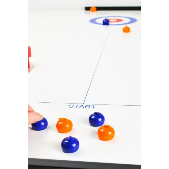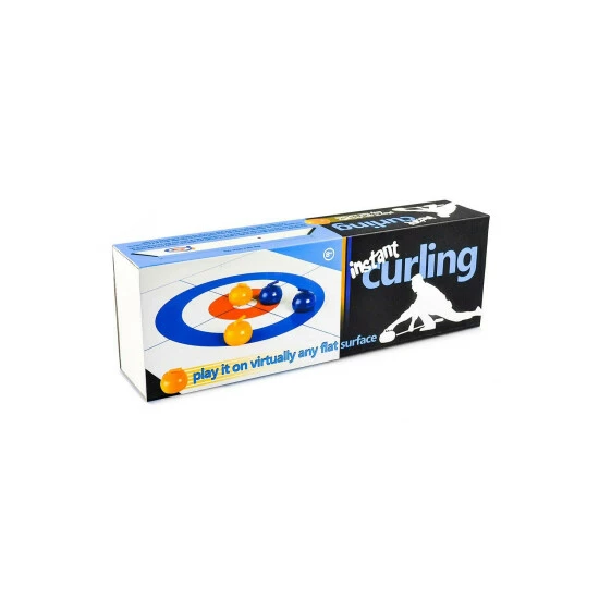 Curling board game. Plays well on most flat surfaces. For 2 players. For ages 8+. Box dimensions: 35.99 cm × 11 cm × 7.01 cm. Rolled-out dimensions: 120 cm × 28 cm. Not suitable for children under 3; small parts