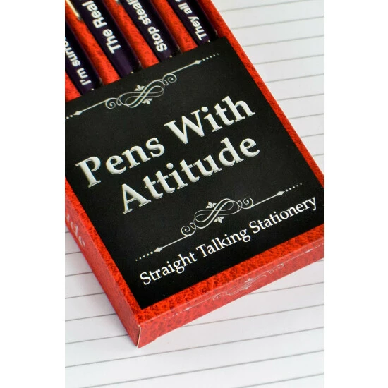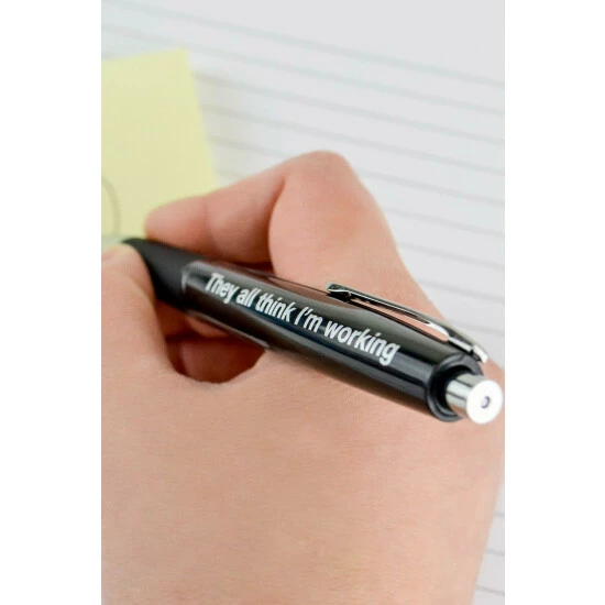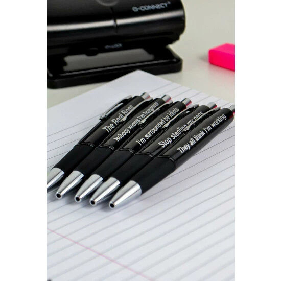Ever wish you could share a message with someone at the office without getting in trouble for it? Now you can, with these Pens with Attitude! These ballpoint pens each have a funny, unique message embossed on the side of the pen. Share things like: I’m the Real Boss, they all think I’m working, I’m surrounded by idiots, nobody knows I’m hungover, stop stealing my pens. These pens are a great gift for a co-worker, boss, or friend. Or get them for yourself to liven up the mood in the office! Grab your five-pack today!