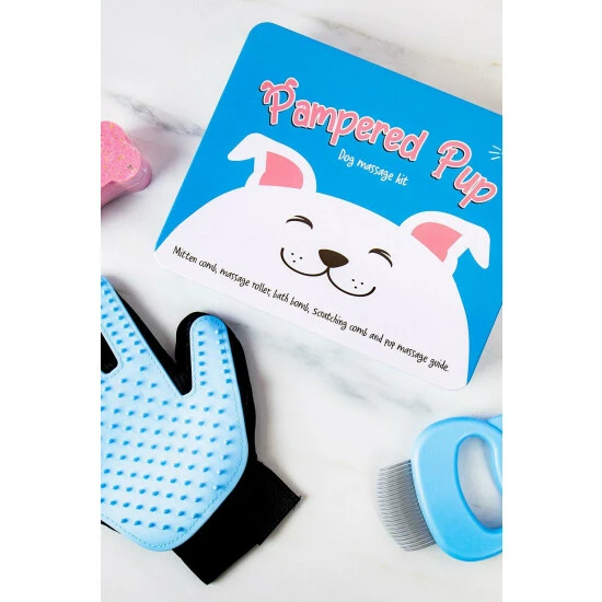 Give your dog a mutt-tastic massage with the Pampered Pup Dog Massage Kit. This kit contains everything a pampered pooch deserves! Includes mitten comb, massage roller, bath bomb, scratching comb and pup massge guide