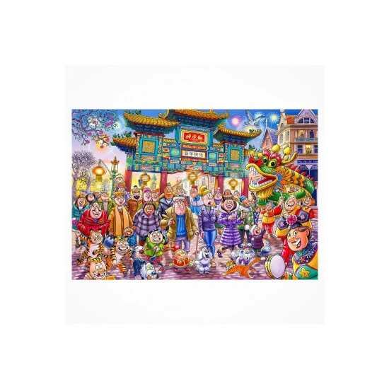 Wasgij Original is a unique brainteasing puzzle concept. Illustrated by the talented artist Paul Gibbs. Produced using high-quality recycled board. ‘Chinese New Year!’ is the title of this hilarious Wasgij Original 39 1000-piece puzzle, where puzzlers are transported to a street being lit up by vibrant Chinese New Year celebrations. Crowds are gathering to welcome the Year of the Tiger and enjoy the fun and fireworks, but what could possibly stop the fearsome tiger-themed parade in its tracks? What has the woman with the smartphone seen that could’ve caused her jaw to drop? That is the image you need to puzzle. Wasgij Original is the puzzle concept where you must use your imagination and clues provided to piece together not what you see on the box, but what the people on the box see! So why is Wasgij so popular? With traditional jigsaws, you build the exact image that’s shown on the box. With Wasgij, you must build an image that’s different from that shown on the box. Although we give a few clues, Wasgij challenges you to use your imagination. Put that together with great drawings and pictorial humour, and it is no surprise that Wasgij has topped the jigsaw puzzle charts for so many years.