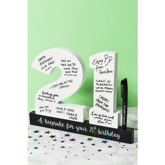 Unique, signature birthday numbers. Marker pen included. A wonderful addition to any 21st birthday party. Keepsake plaque creates memories forever. Dimensions: 22 cm (H) x 25 cm (W)