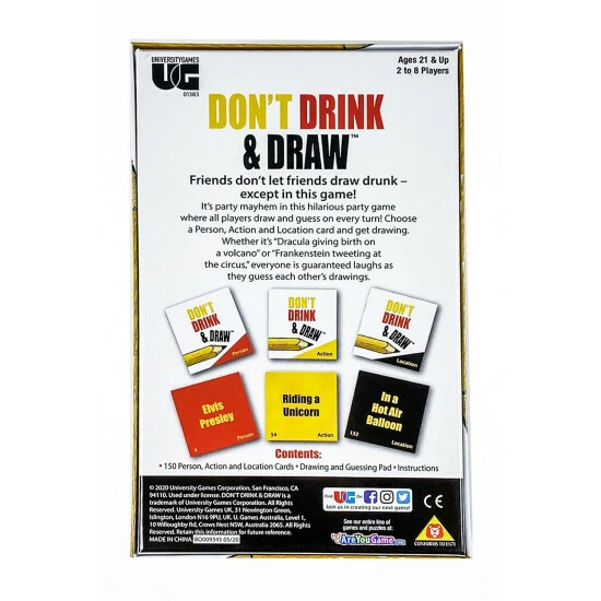 Don’t Drink and Draw is a brilliantly entertaining adult party game for 2-8 players, age 18 years and over. Contents: 50 x Person cards, 50 x location, 50 Action cards, Drawing and Guessing Pad, Instructions. This game is strictly for over 18 years old. Please play and drink responsibly. Alcohol consumption is not required to play. Dimensions 20.2 x 12.5 x 5 cm