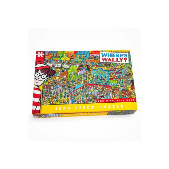 A fantastic 1000 piece Where’s Wally jigsaw puzzle that offers hours of amusing adventures with renowned red and white jumper-wear character! In this jigsaw Wally is out and about in the Wild Wild West. The puzzle shows the hustle and bustle of a Wild West town full of Saloons and plenty of amusing scenes and antics to discover but Where’s Wally? Can you spot him amongst the cowboy chaos? Can you also find his friends Wizard Whitebeard, Wilma, Wenda, Woof, Odlaw and the Wally Watchers? Created by Martin Handford and first published in 1987, Where’s Wally is one of the most recognisable characters in the world and a pop-culture icon. Distinctively dressed in his red and white striped sweater, black framed glasses and a bobble hat, Wally is a word traveller, always in search of the next adventure. Where’s Wally is one of the most recognisable characters in the world, selling over 55 million books globally. The Where’s Wally Wild Wild West puzzle is made from high quality card and comes presented in a rectangular box.